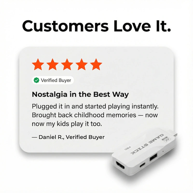Results based on voluntary, self-reported feedback from Retrostick™ Gaming BOX customers. Individual experiences may vary.