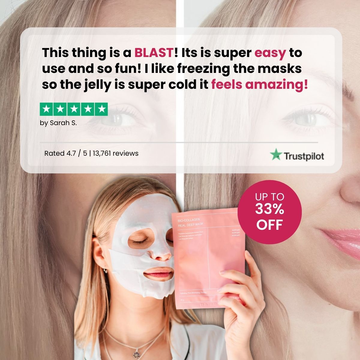 “These collagen face masks are amazing! I actually sleep in them, they stay perfectly in place all night without sliding around. In the morning, they come off easily and leave my skin looking super glowy and feeling deeply hydrated. Total game changer for my skincare routine! A lot of masks also have an odd smell to them, these do not! ”